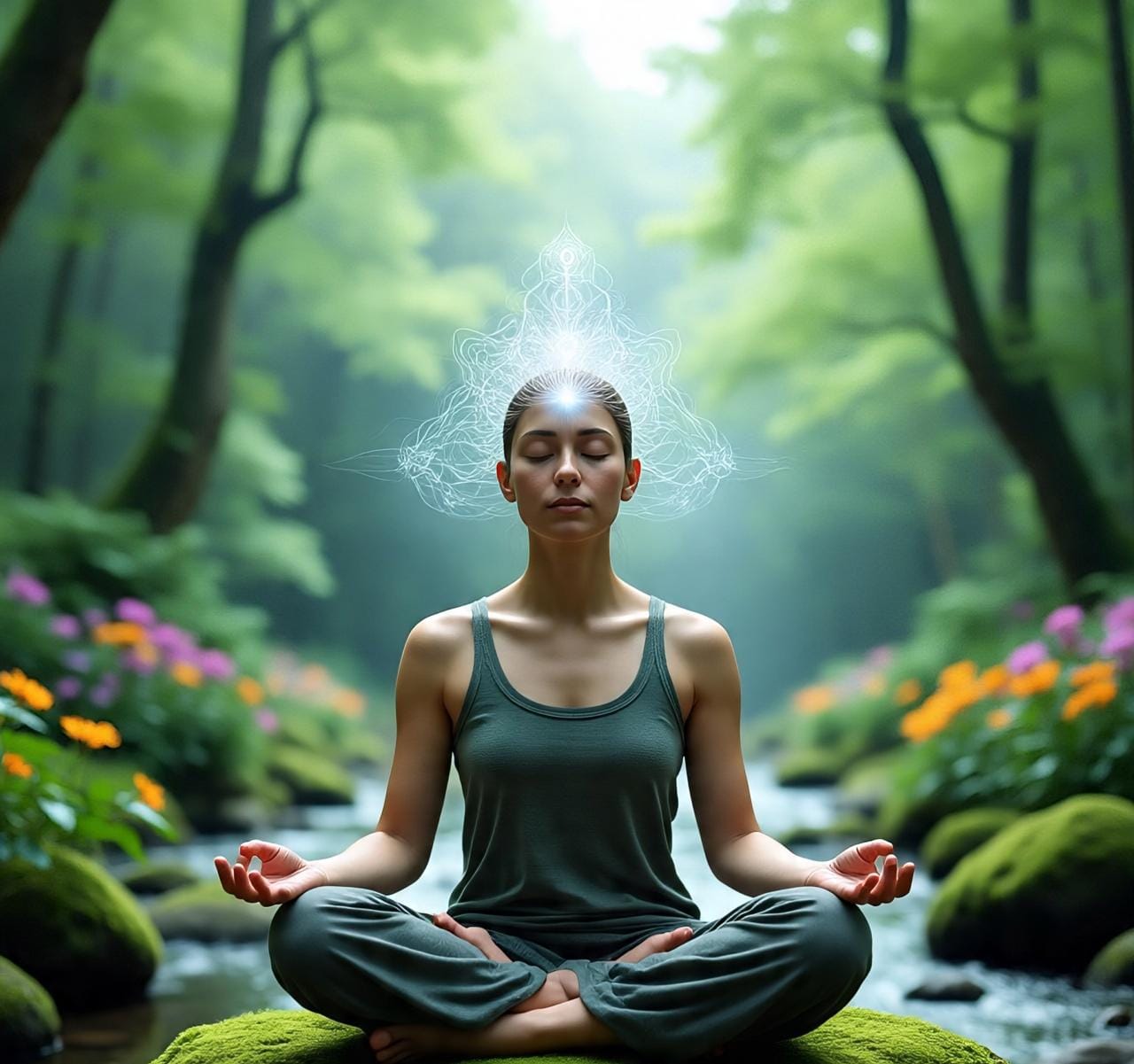 📷 Sugestão de imagem: Meditador em ambiente natural, com representação simbólica de fluxo de energia entre cérebro e natureza.