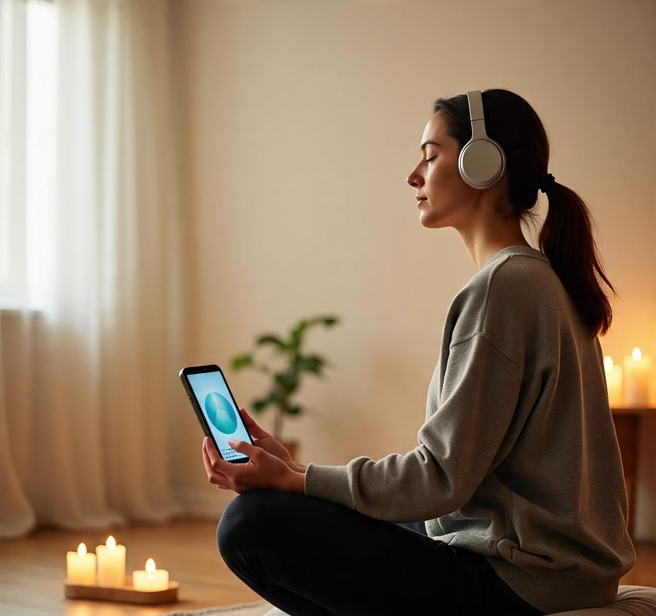 📷 Sugestão de imagem: Representação de uma rotina meditativa matinal com fones e celular, em ambiente harmonizado (vela, planta, cristais).