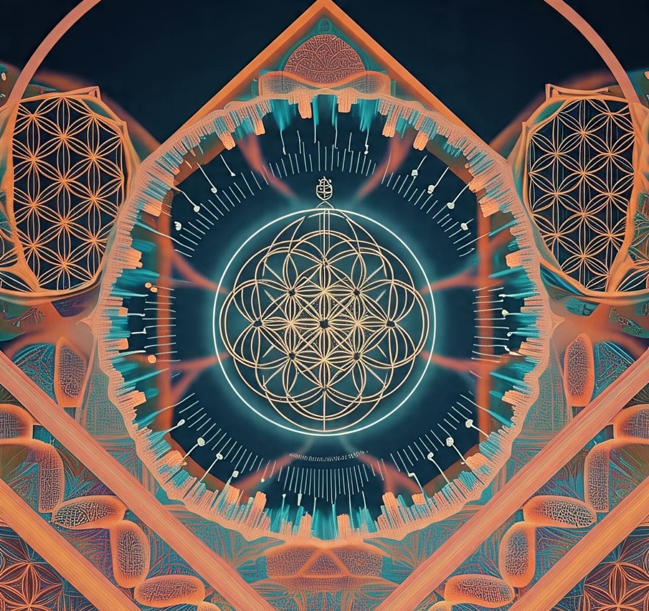 A geometria sagrada é a linguagem da natureza, expressa em padrões como a sequência de Fibonacci, a proporção áurea e o hexágono. Curiosamente, quando os sons dos mantras são visualizados por meio de técnicas como cimática (visualização de som em materiais vibrantes), surgem formas geométricas complexas — muitas delas idênticas às encontradas na natureza e em templos antigos.