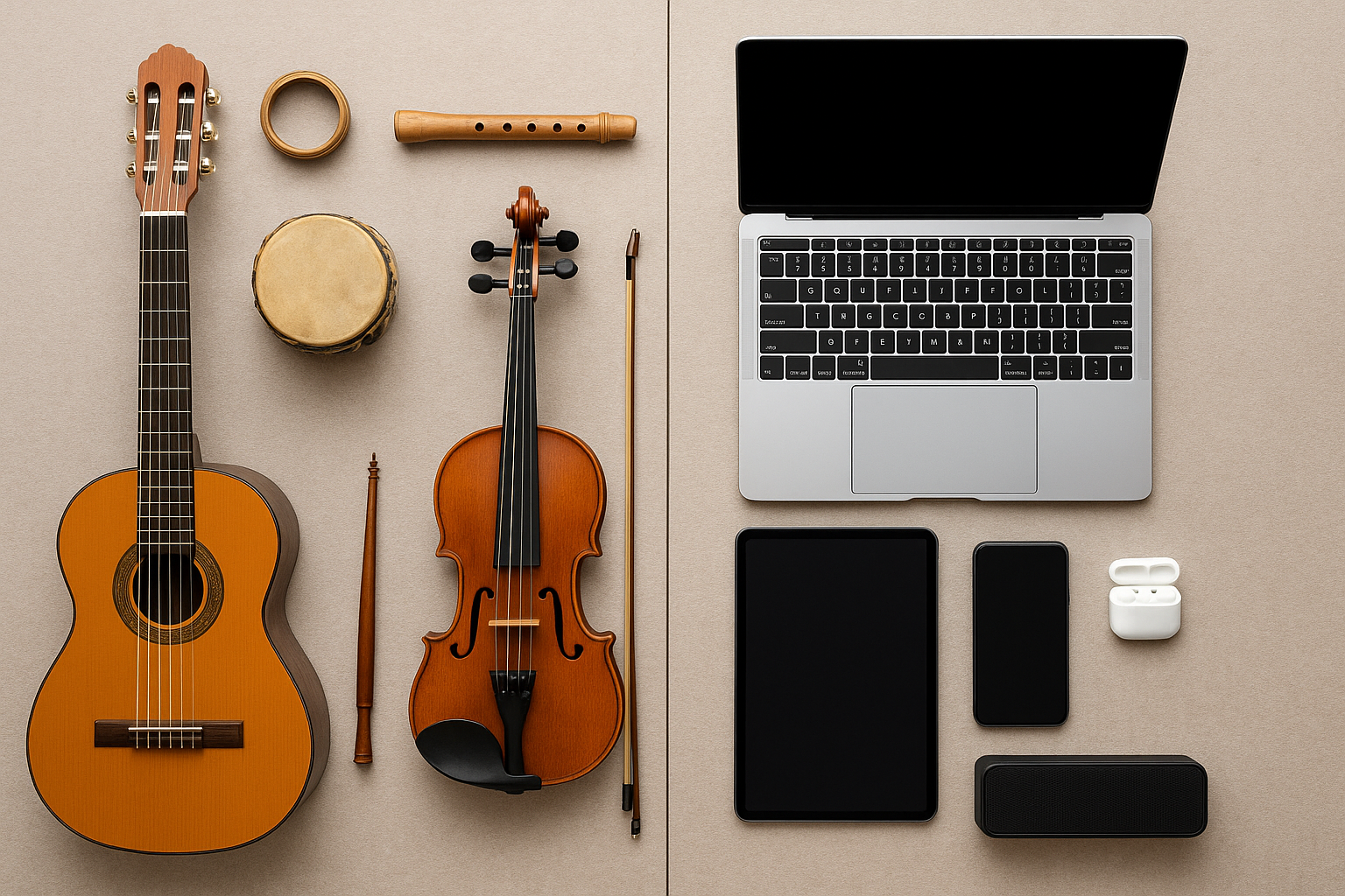 - Usar sons gravados de instrumentos ancestrais como base para trilhas digitais generativas criadas por IA.
