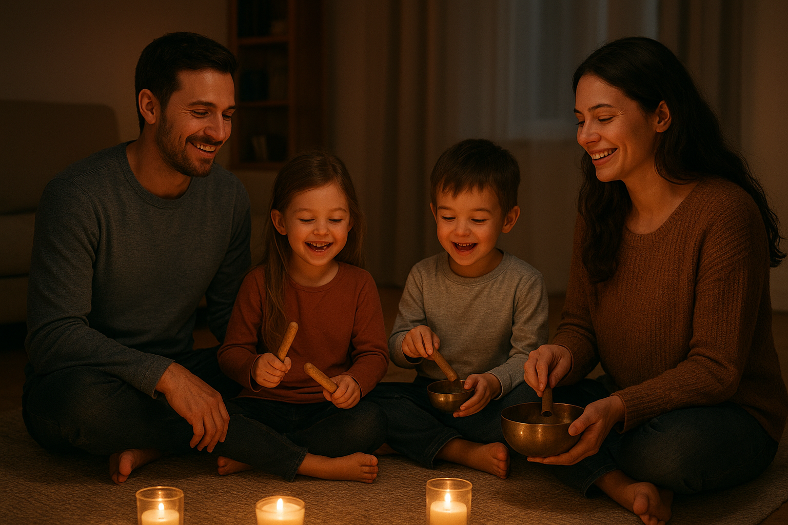 Adaptar a meditação sonora à dinâmica familiar é possível — e altamente recomendável. Com crianças, sons lúdicos (chocalhos de sementes, pequenas flautas, toques em panelas, instrumentos inventados) facilitam a expressão de sentimentos e a concentração. Proponha “viagens sonoras” imaginativas: convidem todos a fechar os olhos e imaginar histórias guiadas por sons naturais (chuva, rio, floresta, passarinhos).