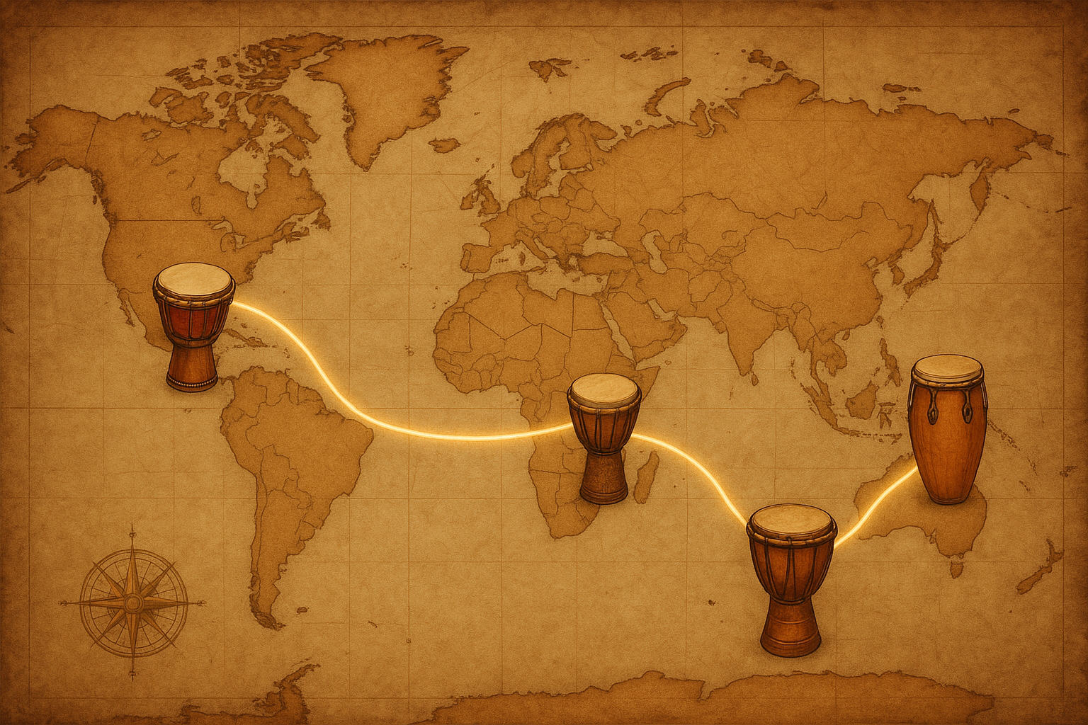 Tambores são, talvez, os mais antigos instrumentos de comunicação, celebração e transcendência da humanidade. Suas peles vibram e narram histórias antes mesmo que tenhamos a palavra escrita, marcando batalhas, nascimentos, ritos de passagem, lutos e celebrações em todos os continentes. Mas, para além de sua ubiquidade na cultura sonora global, a trajetória geográfica e simbólica dos tambores compõe uma das viagens mais fascinantes de nossa história: do Extremo Oriente às Áfricas, da Eurásia à Europa, das Índias à América, eles se transformaram, adaptaram, cruzaram mares e desertos — e a cada parada renovaram significados, formas e funções.