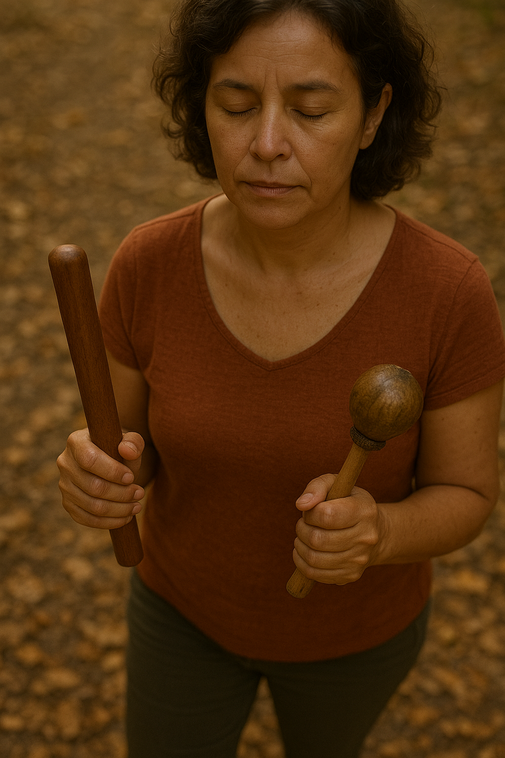 Sons simples e repetitivos atuam como Âncoras sensoriais, ajudam a modular o ritmo respiratório, facilitam o reconhecimento do terreno e intensificam a perceção do aqui e agora. Em grupos, instrumentos percussivos são também ferramenta de coesão: ritmos conjuntos geram sincronia neuromuscular, melhorando cooperação, empatia e segurança emocional.