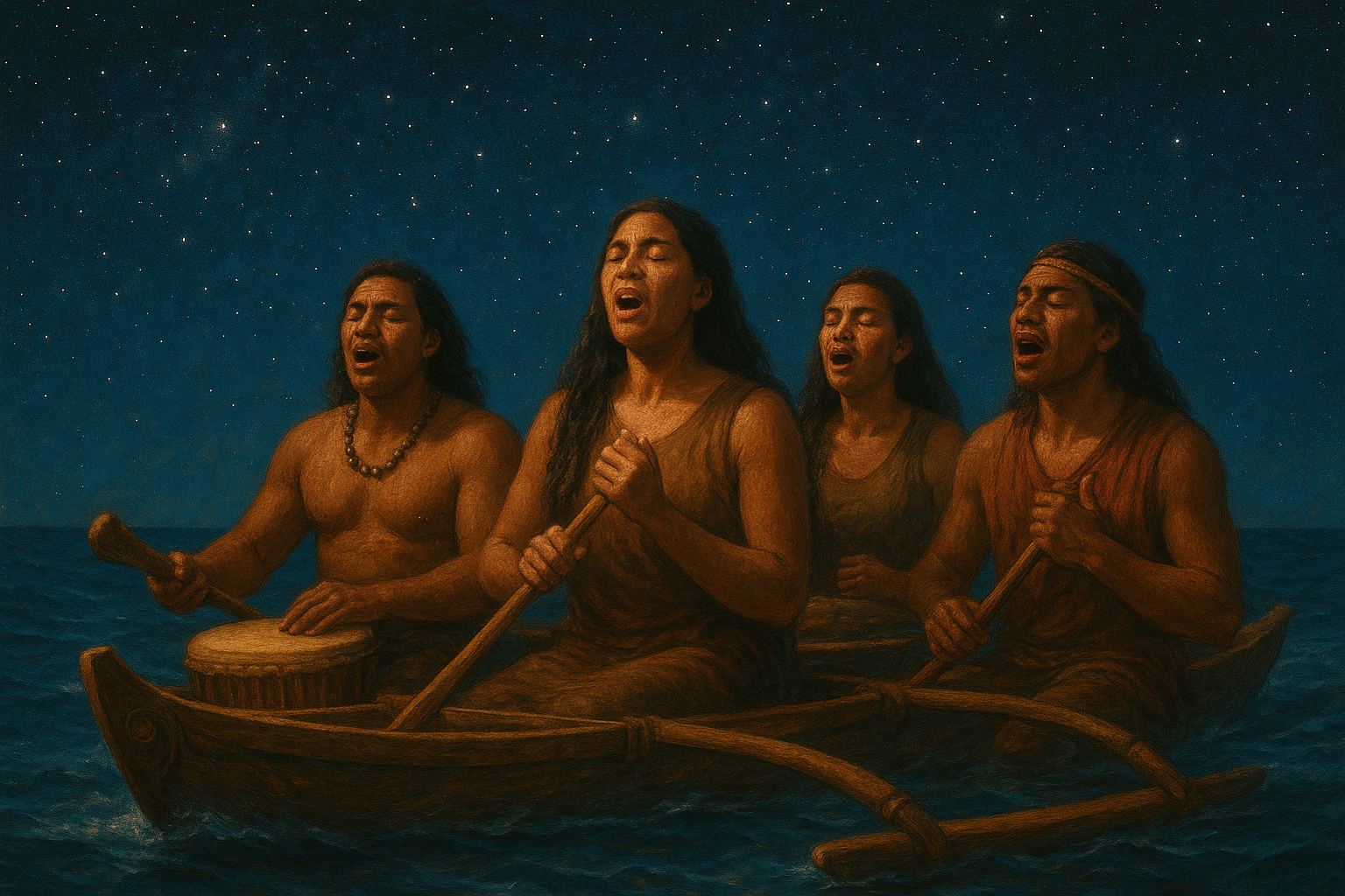 Navegadores polinésios (wayfinders) eram iniciados, desde muito jovens, no repertório dos cantos de navegação. Sem mapas escritos, aprendiam a orientar-se por estrelas, correntes, direção das aves e nuvens – mas também decoravam longos cantos que “desenhavam” mentalmente a posição das ilhas, pontos cardeais, timings de jornada e dicas de sobrevivência.