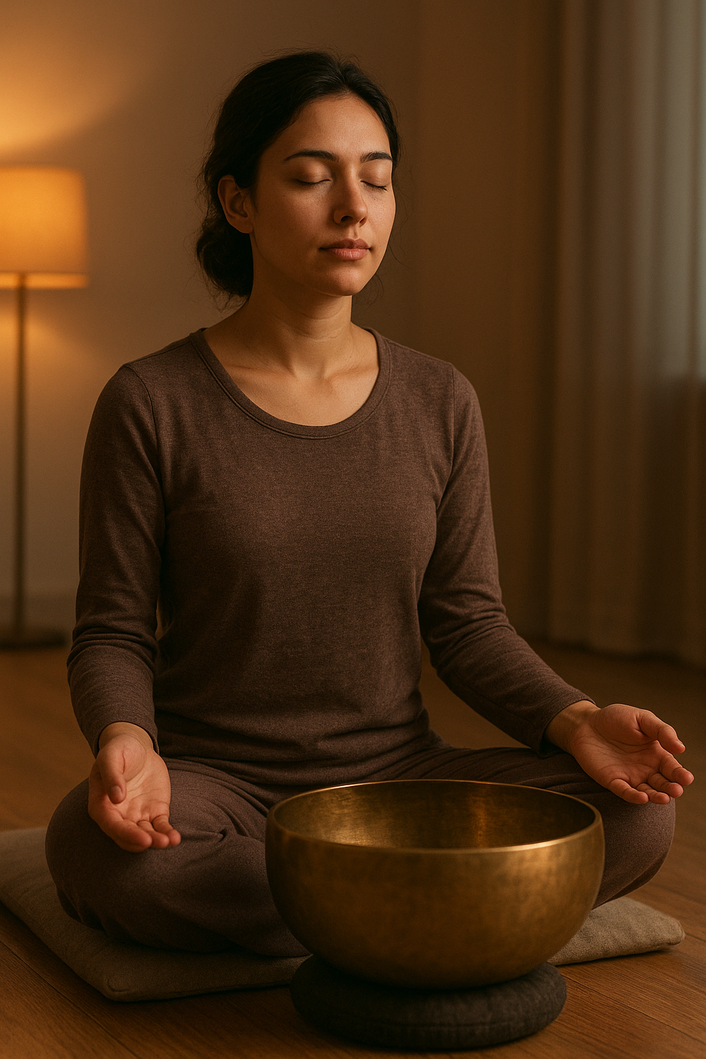 Pratique ouvir trilhas de bowls graves, tambores, drones e sons naturais como ondas e trovões de forma meditativa, atento às sensações físicas e emoções evocadas.