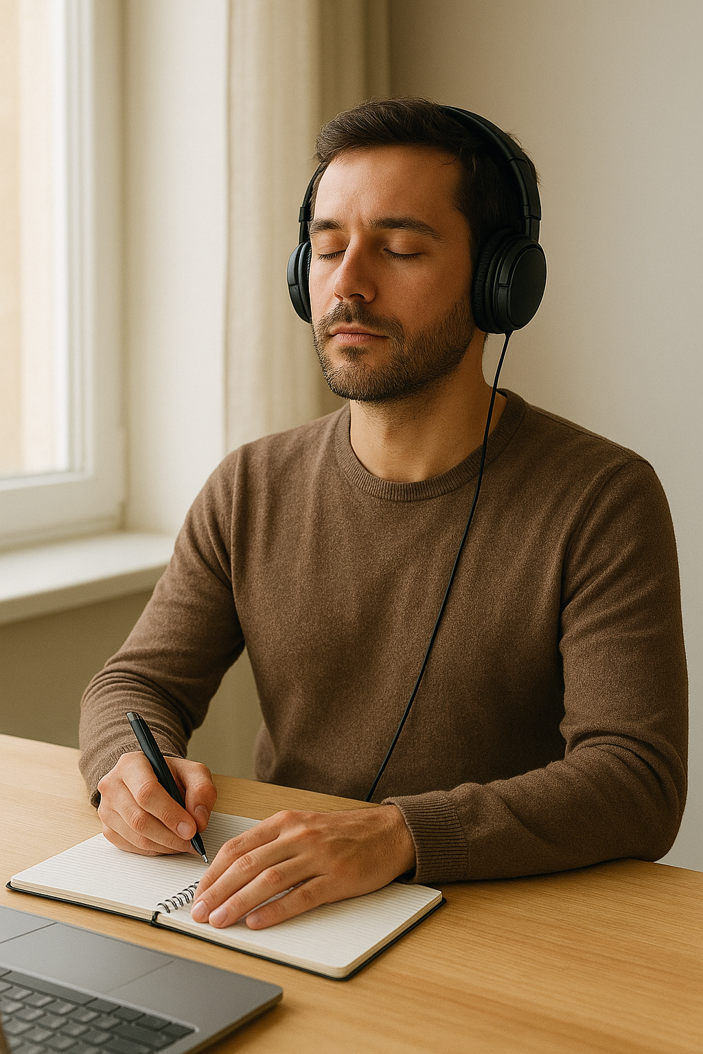Faça 5 minutos de escuta atenta, agora de trilha mais leve, marcando encerramento e sensação de realização.