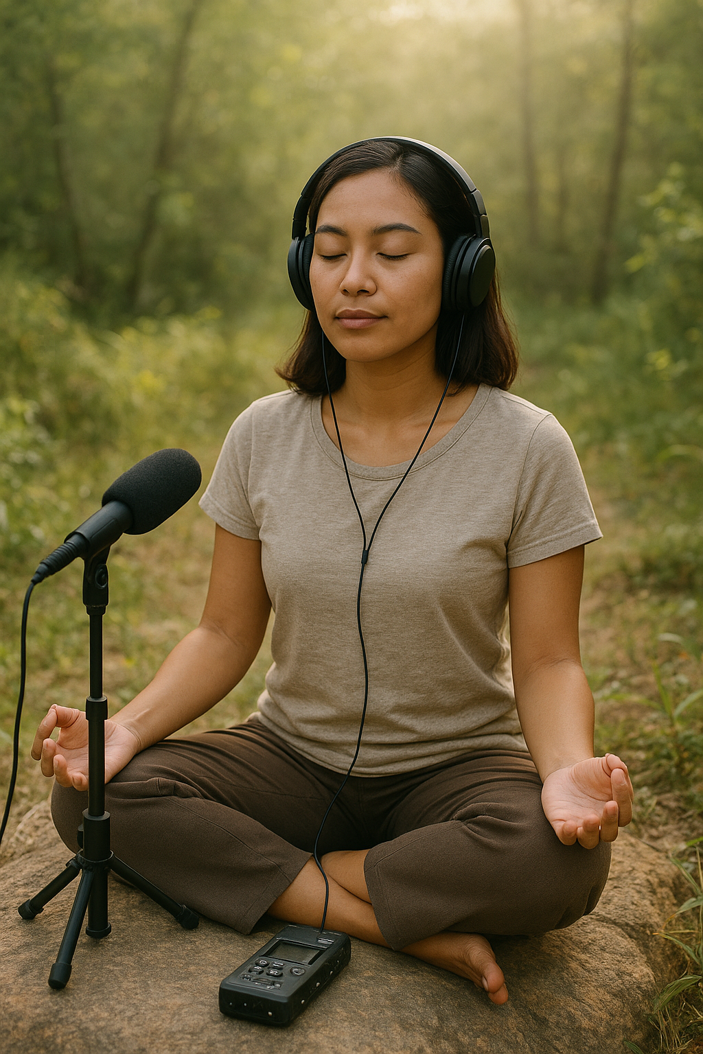 Combinar field recordings com instrumentos meditativos — bowls tibetanos, shruti box, sinos, harpa, gongos, monocórdios, flautas nativas, drones eletrônicos, pads e texturas digitais — cria riqueza e profundidade. Técnicas de overdub (sobreposição), loopings e layers tornam a experiência mais hipnótica.
