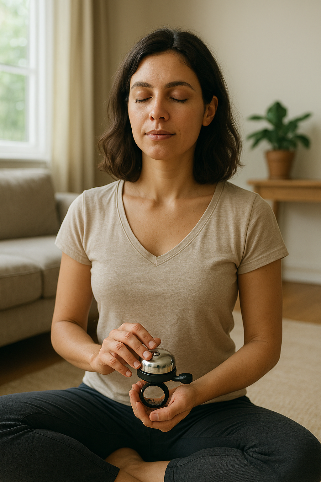 Mini-pausas durante o trabalho: um sino de bicicleta ao lado do computador pode marcar pausas de atenção plena ao longo do expediente.