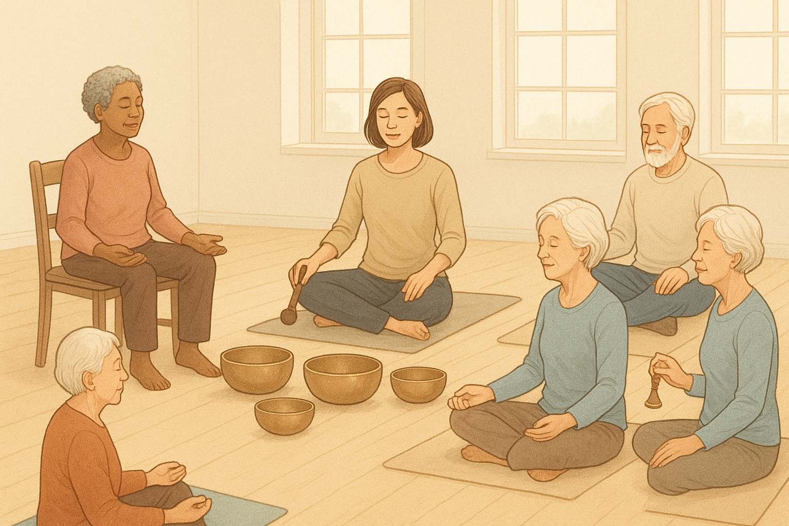 Sessões de meditação em grupo com som favorecem a sensação de pertencimento e apoio social, que é fator protetor imunológico bem documentado em idosos.